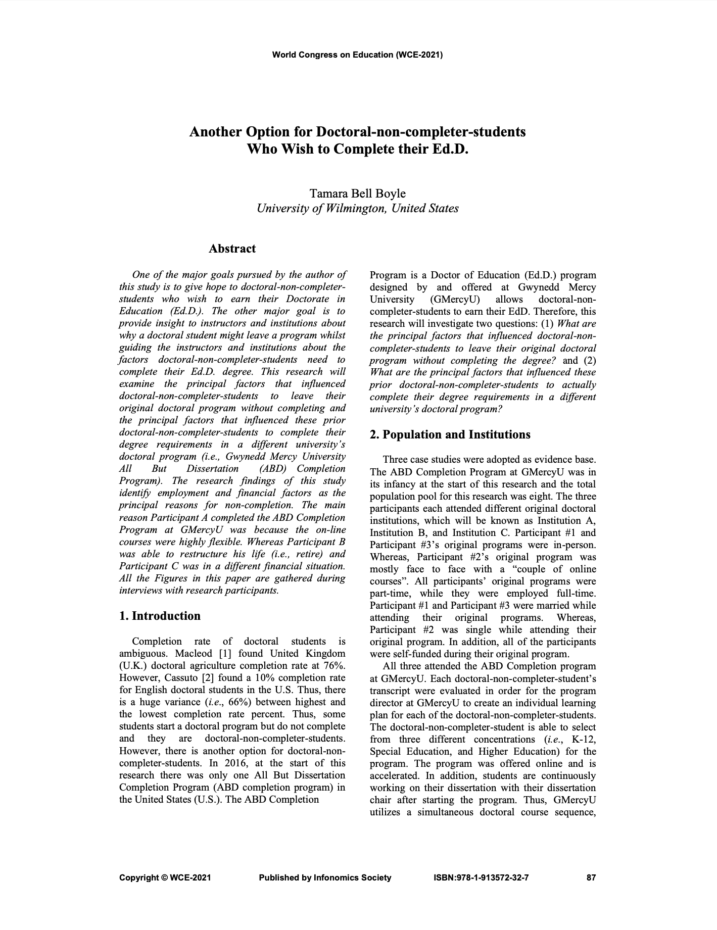 Boyle, T.B. (2021, June 24). Another Option for Doctoral-non-completer-students Who Wish to Complete their Ed.D. Canada International Conference on Education (CICE-2021) in collaboration with World Congress on Education (WCE-2021). Toronto, Canada.