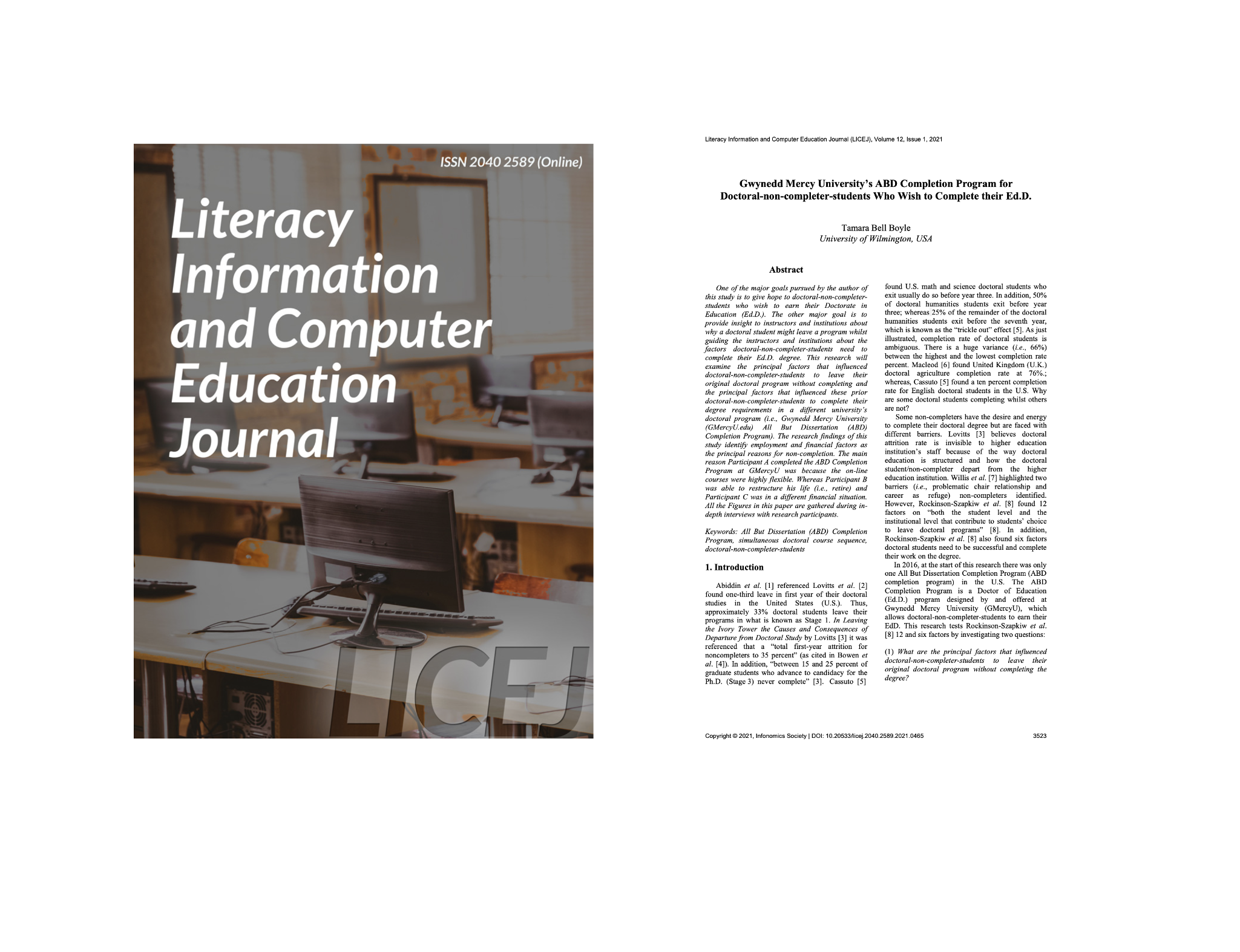Boyle, T. B. (2021). Gwynedd Mercy University’s ABD Completion Program for Doctoral-non-completer-students Who Wish to Complete their Ed.D. Literacy Information and Computer Education Journal (LICEJ), Volume 12, Issue 1, ISSN: 2040 2589